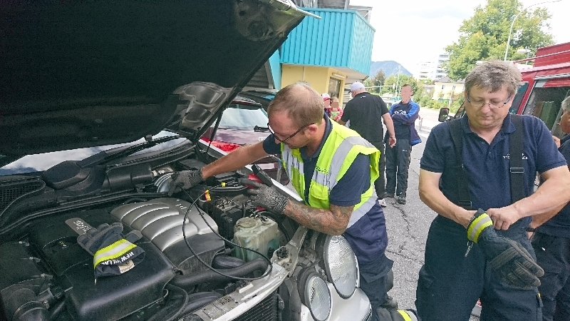 „Das Tier konnte erst mit einer sogenannten Endoskop-Kamera lokalisiert werden. In weiterer Folge musste das Auto mit einem Wagenheber angehoben werden und Teile des Radkastens demontiert werden. Dann konnte die Katze aus ihrer misslichen Lage befreit werden“.