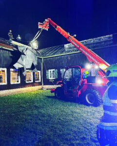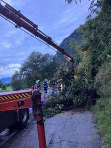 An weiteren Einsatzstellen mussten teilweise mit Kranfahrzeugen und Seilwinden umgestürzte Bäume von Straßen geräumt werden. Auch auf der Villacher Alpenstraße mussten unzählige Bäume durch 3 Feuerwehren von der Straße entfernt werden.