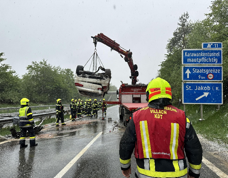 Kurz nach 12 Uhr 30 Uhr mittags wurde die Hauptfeuerwache Villach gemeinsam mit der FF Drobollach und der FF St. Jakob zu einem gemeldeten, schweren Verkehrsunfall mit vermutlich eingeklemmter Person auf die A11 Karawankenautobahn in Fahrtrichtung Slowenien, kurz vor der Abfahrt St. Jakob alarmiert.