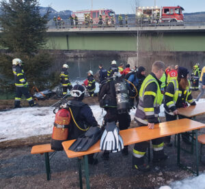 Dort ist ein PKW von der Brücke in die Drau gestürzt und die Innsassen sollten sich noch im Fahrzeug befinden, so die Einsatzmeldung. Sofort rückten wir mit dem Kommandofahrzeug, dem Wasserdienstfahrzeug mit 4 Einsatztauchern sowie dem Kleinrüstfahrzeug mit Rettungsboot zum Unfallort aus.