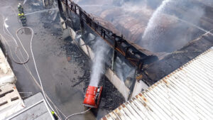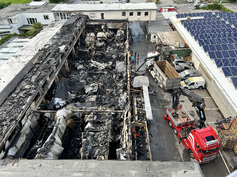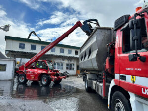 Für die weiteren punktuellen Löscharbeiten stelle das eingestürzte Blechdach ein Hindernis dar, welches mit Unterstützung eines Kranfahrzeuges der Fa. Grollitsch entfernt wurde. Die Dachelemente wurden in weiterer Folge mit Unterstützung vom Telelader der HFW in Container verladen. Somit war der Zugang zu Teilbereichen der Halle möglich um gezielt die Nachlöscharbeiten fortführen zu können.