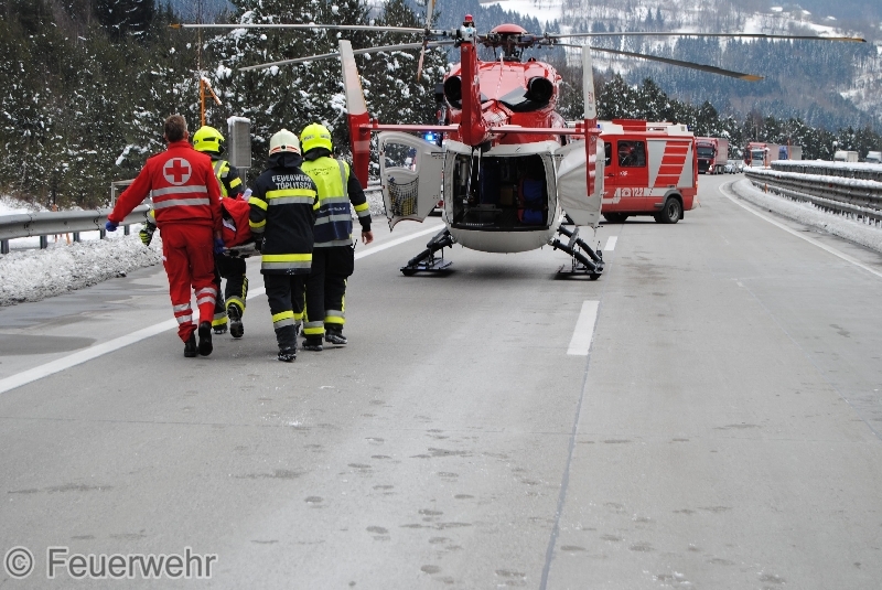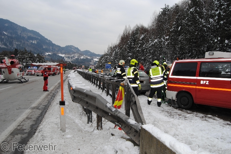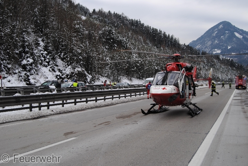 Ein PKW war aus noch unbekannter Ursache in die Mitteleitschiene gekracht. Der ältere Lenker konnte dadurch die Tür nicht mehr öffnen. Die Beifahrerin konnte das Fahrzeug selbständig verlassen. Unverzüglich wurde nach dem Eintreffen der Hauptfeuerwache, die Autobahn für die Landung des Notarzthubschraubers RK 1 gesperrt und nach Absprache mit dem Roten Kreuz der PKW von der Leitschiene weggezogen.
