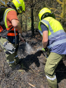 Nachdem der Hubschrauber die Löschmaßnahmen aus der Luft beendet hatte, musste in mühevoller Handarbeit mit Waldbrandwerkzeug der Boden aufgegraben werden, um die Glutnester danach mit sogenannten Löschrucksäcken zu bekämpfen.