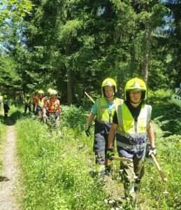 Der Einsatzort war nur zu Fuß, durch den Wald erreichbar. Somit mussten bei rund 32 Grad Celsius Außentemperatur, mühevoll mehrere Schlauchleitungen zum Brandherd verlegt werden.