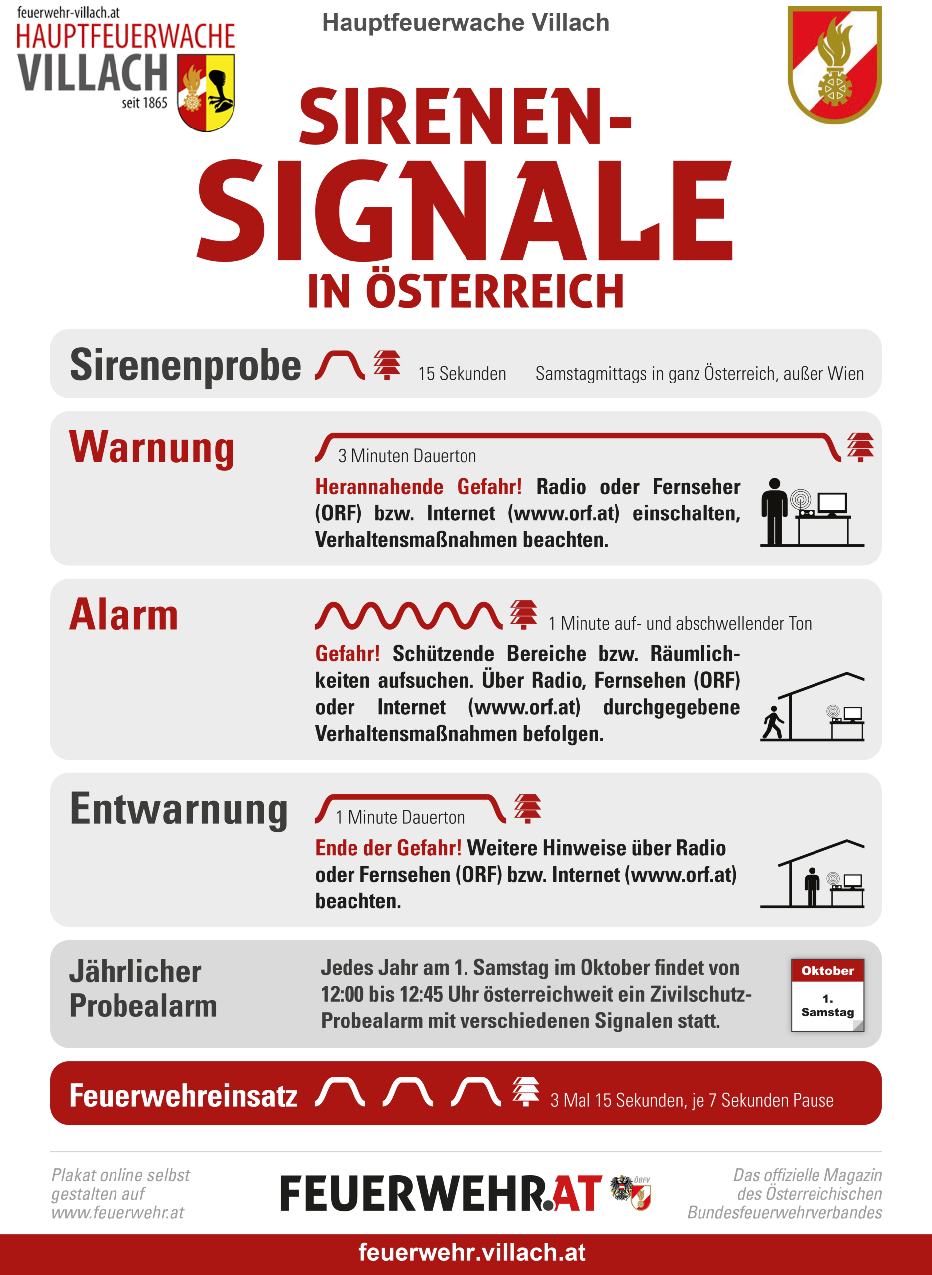 Am Samstag, 5. Oktober 2019, wird wieder der österreichweite Zivilschutz-Probealarm vom Bundesministerium für Inneres (BM.I) durchgeführt. Der Probealarm soll Sie mit den Zivilschutz-Signalen vertraut machen und gleichzeitig die Funktion und Reichweite der über 8.000 Sirenen testen.